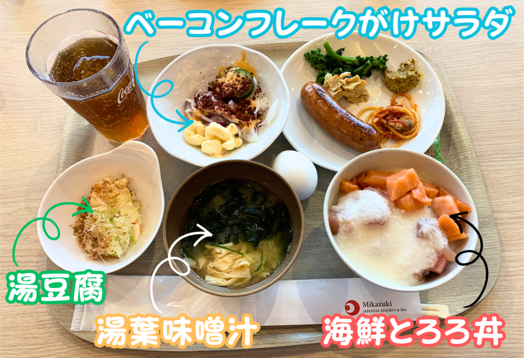 焼き立てパンやフレッシュなサラダ、ウインナーなどの洋食メニューはもちろん、和食派には、海鮮丼、煮物、お味噌汁、ご飯などが豊富に用意されています。