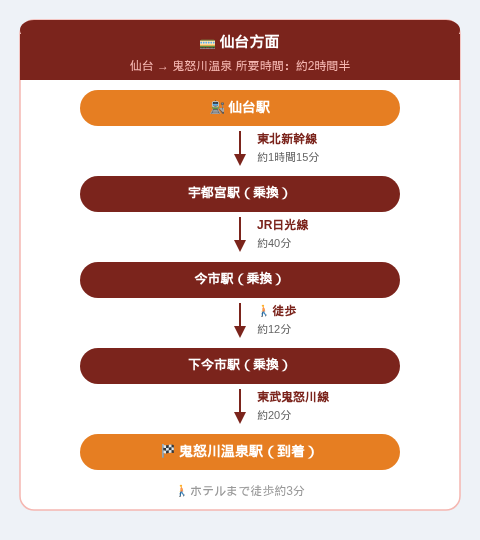 東北方面から行く場合は、東北新幹線→JR→東武鉄道の順に乗り換えが必要です。