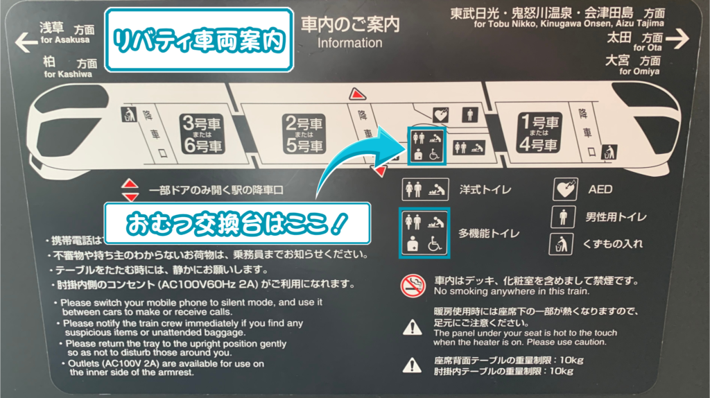 赤ちゃんがいる場合、リバティは1号車(3両編成)、4号車(6両編成)の後ろか、2号車(3両編成)、5号車(6両編成)のが、多目的トイレが近くていいわね🚻