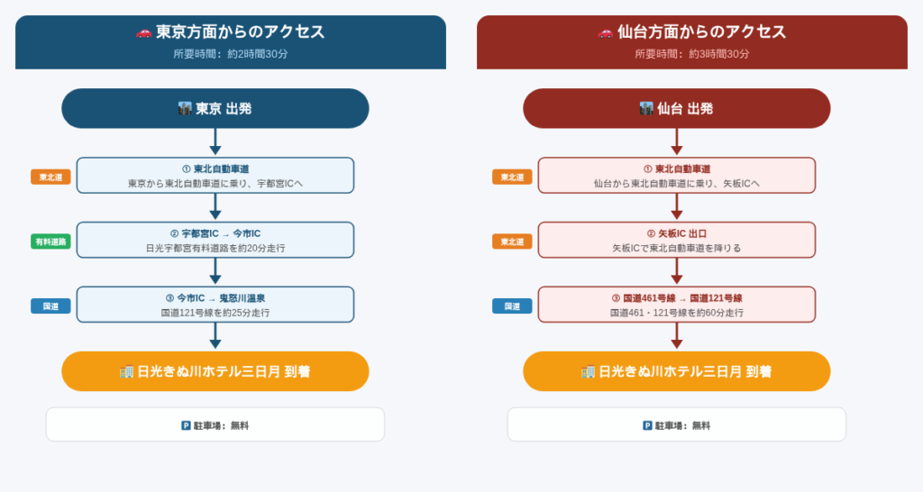 “日光きぬ川ホテル三日月”へは、車か電車で行くことができます。