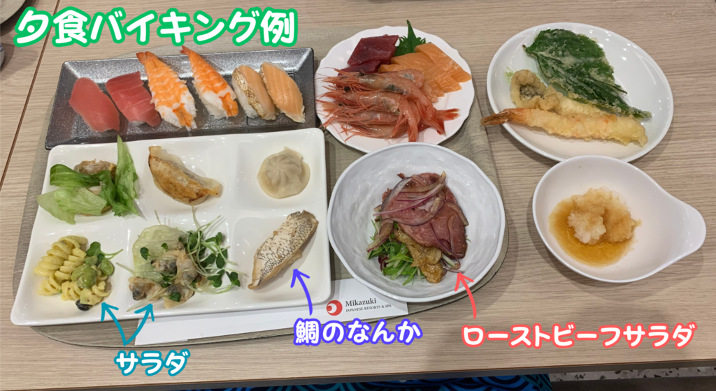 天ぷらの実演コーナーがあったり、ステーキを目の前で焼いてくれたり、ライブキッチン形式で出来立ての温かい料理が楽しめるのも嬉しいポイントです。