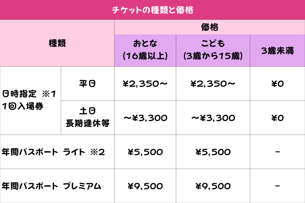 チケットは、日時指定の1回入場券、年間パスポートライト、年間パスポートプレミアムの3種類あります。