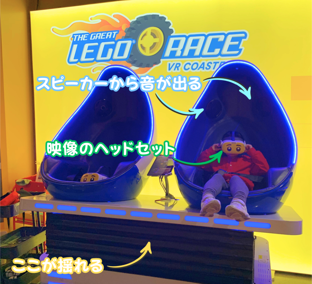 VRアトラクションは、この時はレゴの自動車レースを体験するもので、VRの視覚と音とイスの揺れで臨場感があるものでした!